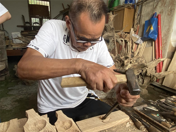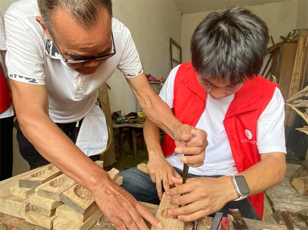 实践队探访金兰村根雕艺人赵宋珍,聆听其跋涉百余个山头取材、数十年坚守创作的故事。赵宋珍现场演示根雕技艺,队员在指导下尝试雕琢木料,从生疏到渐入节奏,体悟“慢工出细活”的匠心,明确非遗传承的责任与使命。