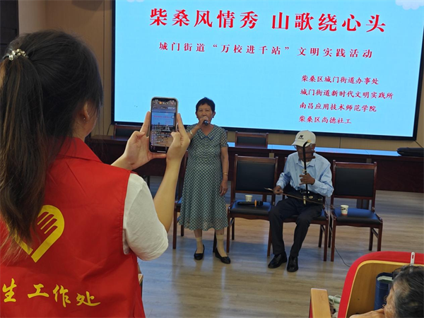 实践队在乡贤馆开展“柴桑风情秀,山歌绕心头”活动,欣赏老艺人演唱《行大船,走江边》等经典曲目,跟学《梁山伯与祝英台》山歌唱法,学习方言发音与颤音技巧。通过线上直播传播山歌的魅力,为非遗文化注入科技传播新动能。