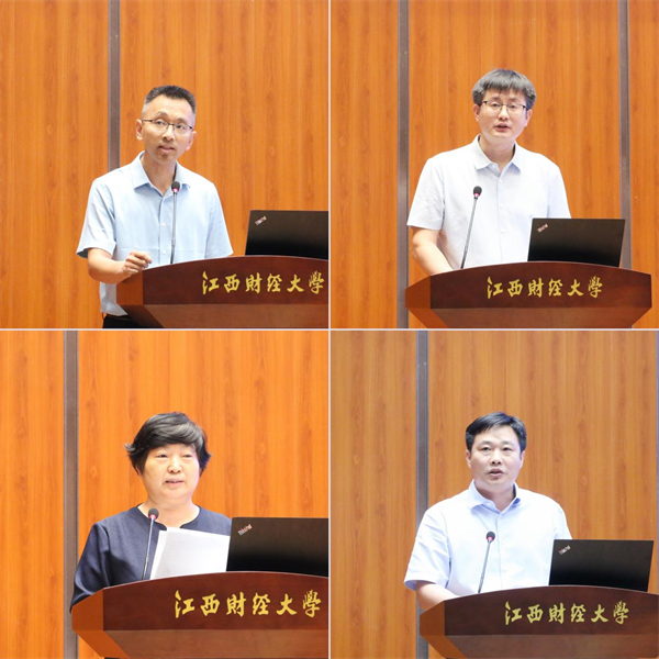 虚拟现实(VR)现代产业学院院长万征作为科技成果转化工作代表发言,财经数据科学重点实验室主任刘小惠作为科研平台建设单位代表发言,国际经济与政治学院教授李秀香作为智库工作代表发言。科研处处长谌飞龙通报了科研工作相关情况。