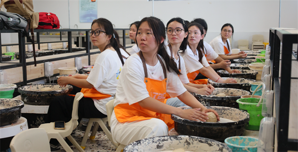 “揉泥要像揉面团,三分力道七分匀。”在陶博城研学工坊,实践队队员们在导师的指导下,将高岭土揉成一团,随着电动转盘的匀速转动,掌心的泥团逐渐变化,塑造出一个个形态各异的陶坯。