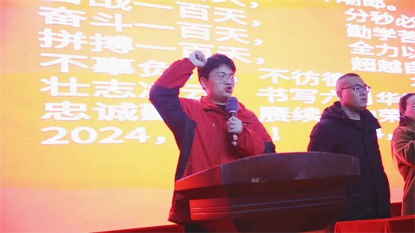 “有志者,事竟成,破釜沉舟,百二秦关终属楚;苦心人,天不负,卧薪尝胆,三千越甲可吞吴”高三学生代表彭子涵鼓励同学们,在这最后100天,要学习董仲舒目不窥园的毅力,一心向学;学习苏秦刺股的决心,刻苦努力;学习贾岛推敲的态度,精益求精,以雄心壮志决胜高考,不留遗憾。