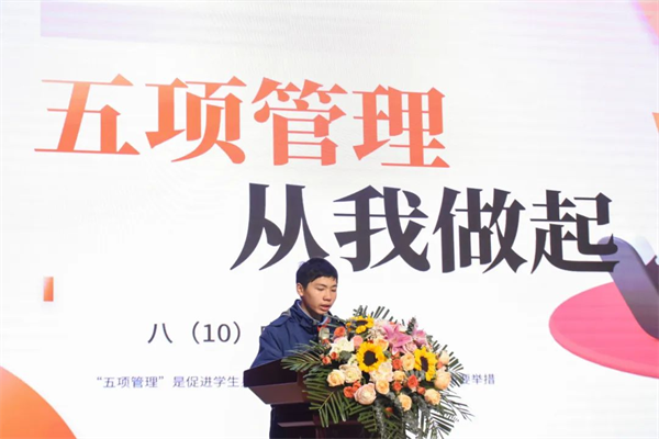 “五项管理”是关系学生健康成长,推进立德树人的重大举措。初二10班胡达成同学从作业、睡眠、手机、读物、体质等方面向大家作报告,严格要求自我,号召全体同学争做榜样!