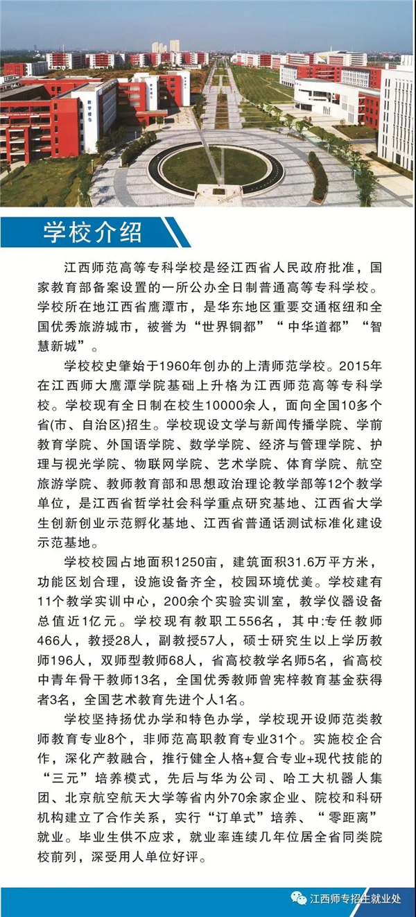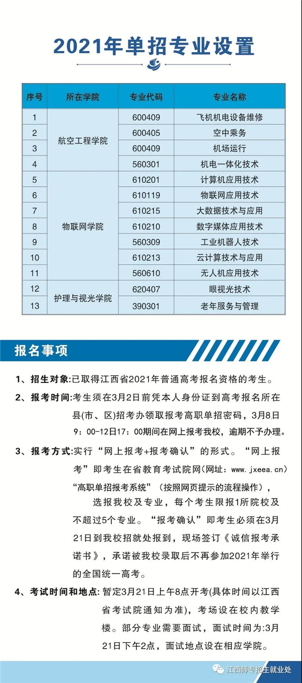 金宝搏188入口 讯近日,江西省教育厅发布《关于做好江西省2021年普通高校专项计划招生工作的通知》,对今年江西省高职单招工作进行了安排。根据要求,各单招院校要根据自身办学定位和培养目标,制定本校2021年单独考试招生简章。以下是江西师范高等专科学校2021年单招招生简章。