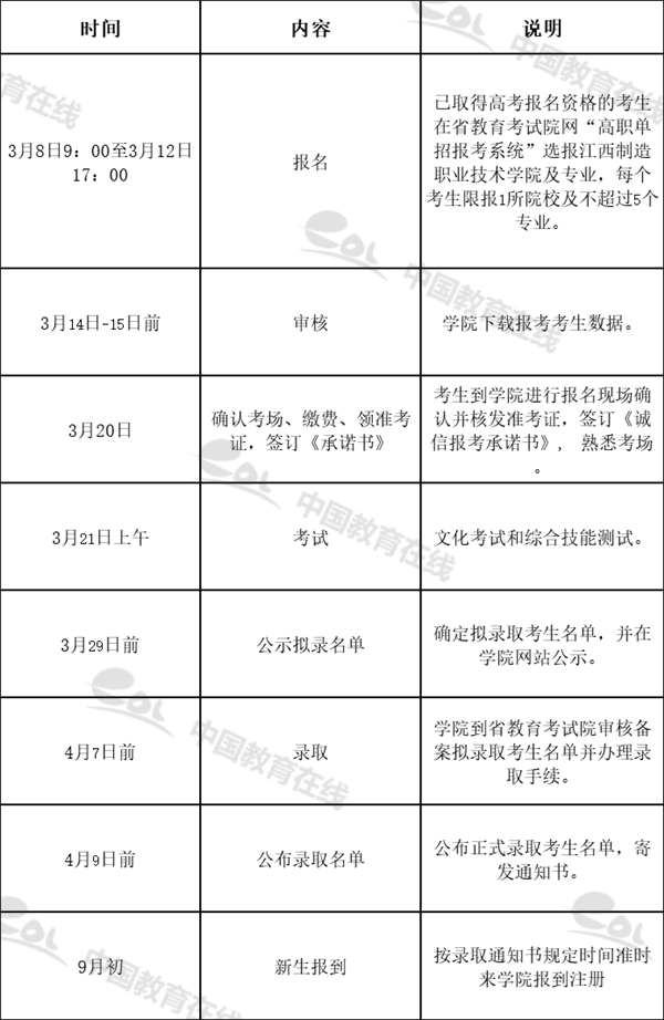 报名时间是3月8日9:00—12日17:00期间。已取得高考报名资格的考生在省教育考试院网(网址:www.jxeea.cn)“高职单招报考系统”(按照网面提示的流程操作),选报江西制造职业技术学院(代码8621)及专业,每个考生限报1所院校,可选报1至5个专业及是否服从专业调剂。在规定的网报时间内,考生可以对所报考院校及专业修改1次。