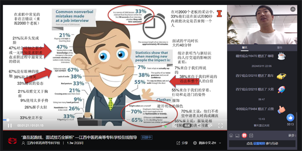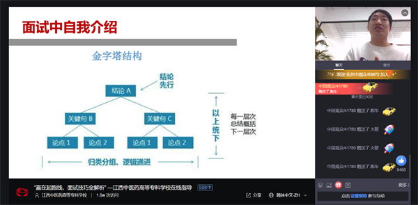 吴小湖讲师以“个体面试与表达能力提升”为主题,鼓励江西中医药高等专科学校及就业桥全国的毕业生提前做面试准备,针对面试中的关键点,做逐条拆解,旨在提高毕业生的求职成功率。