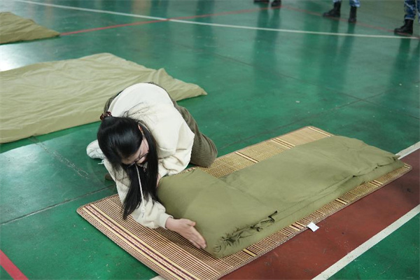 赛场上,班主任们全神贯注,动作娴熟,双手迅速地摆弄着被子,展现出令人惊叹的生活技能。