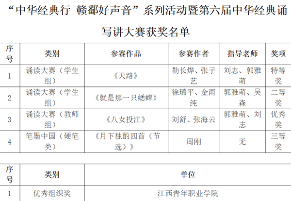 近日,省教育厅举办的“中华经典行·赣鄱好声音”系列活动暨第六届中华经典诵写讲大赛获奖名单揭晓。江西青年职业学院在本次大赛中斩获多项奖项。