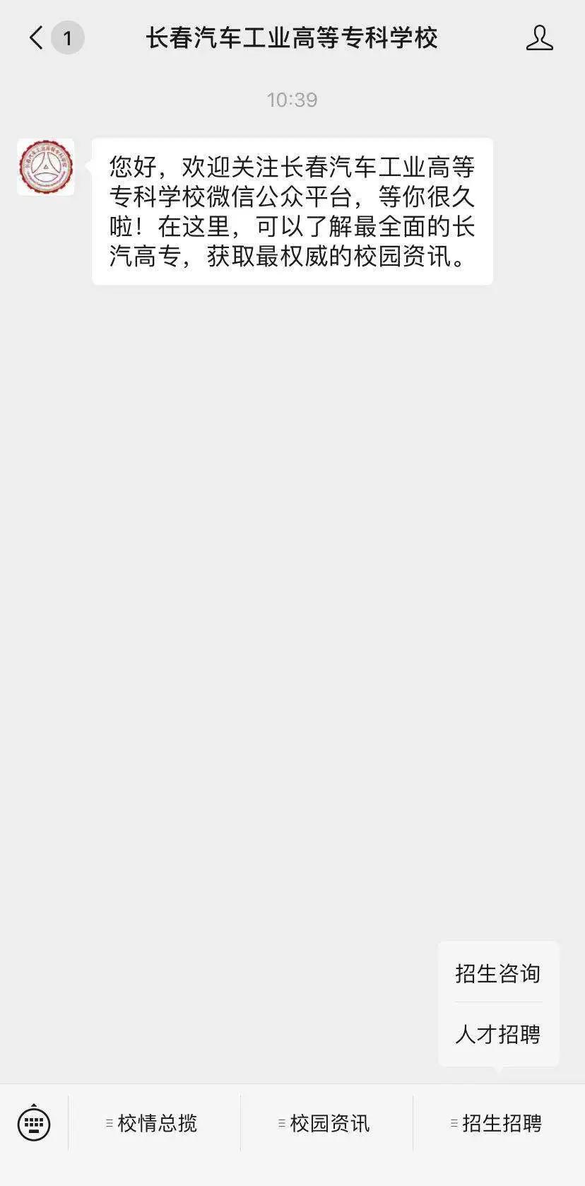 01.微信搜索“长春汽车工业高等专科学校”(或扫描本文底部二维码)关注长春汽车工业高等专科学校官方微信公众平台。