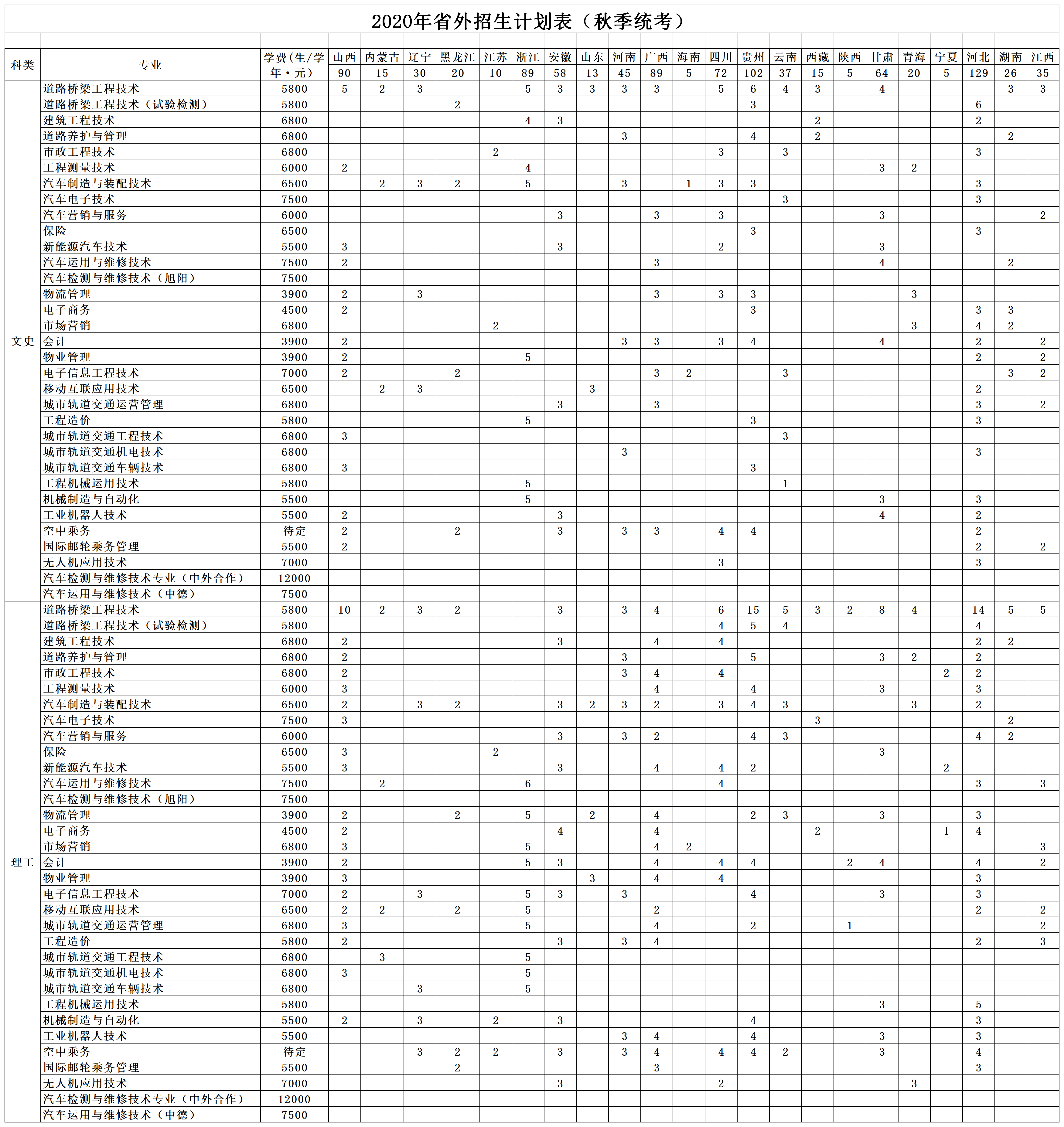 学校下设10个学院、2个部和2个校企合作分院共14个教学部门。开设33个专业,建有国家级试点专业2个,省级示范专业8个,省级品牌专业群5个,国家骨干院校重点建设专业5个,专业覆盖道路与桥梁工程、汽车运用工程、轨道工程、物流管理、机械制造等领域,构建了与产业链对接的“道路-车辆-物流-信息”一体化专业链。