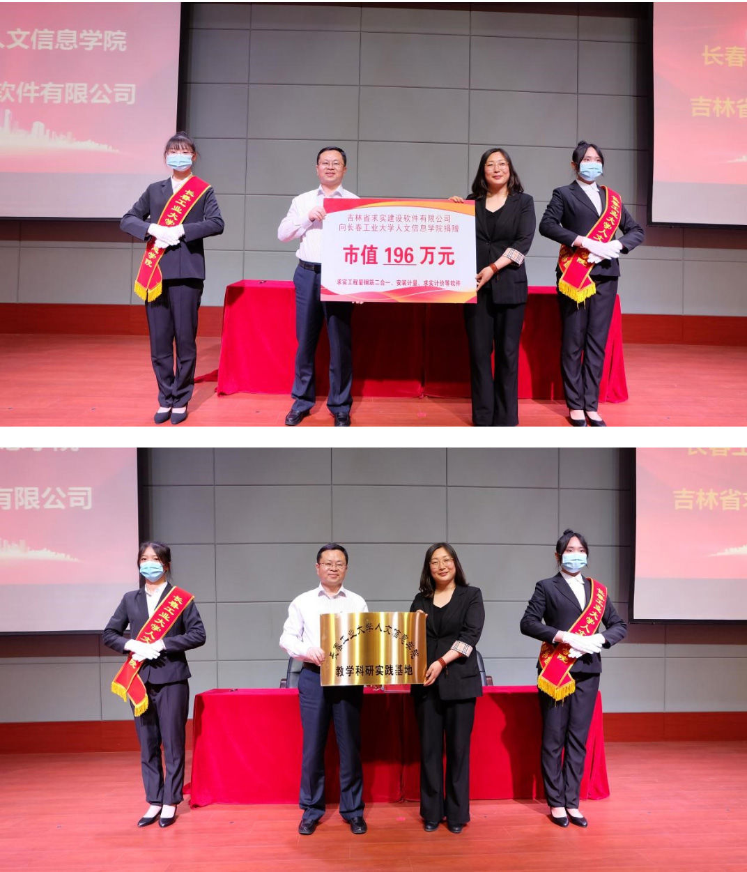 会上,吉林省求实建设软件有限公司宋艳萍总经理向我校捐赠了市值196万元的正版求实计量计价软件,程军书记代表学校授予吉林省求实建设软件有限公司“教学科研实践基地”牌匾。