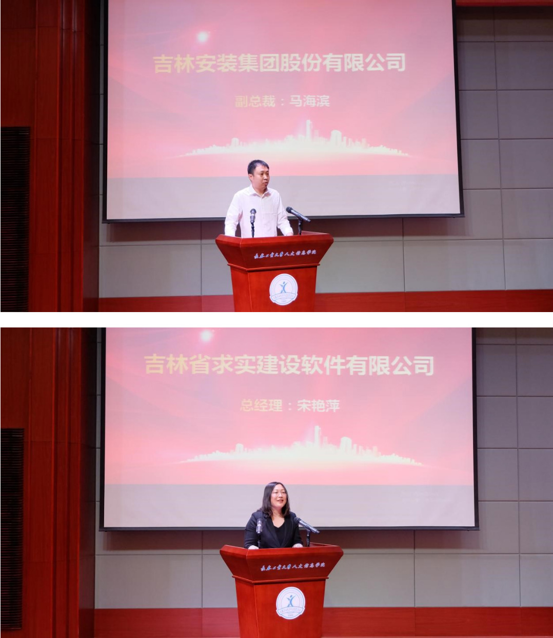 吉林安装集团股份有限公司副总裁马海滨、吉林省求实建设软件有限公司总经理宋艳萍代表合作企业发言。两位领导对我校办学理念和特色给予高度评价,对学生阳光励志、踏实勤勉、勇于进取、乐于奉献的精神给予肯定,表达了进一步深化校企合作的期望与信心,表达了作为吉林省本地企业与政府、高校一起为我省发展做出贡献的决心。