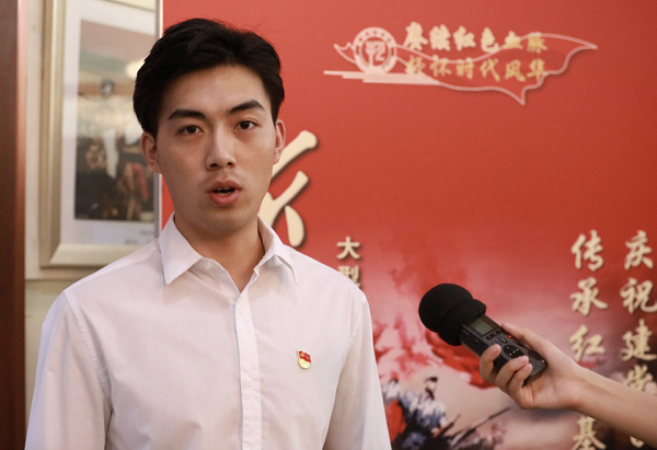 我在剧中担任的是赵团长,对于这个角色,刚刚开始的时候我不太了解,但是随着排练的深入,我感受到了沂蒙精神和军民鱼水情,作为新一代的年轻人我们不能忘记历史,不能忘记祖祖辈辈的艰苦付出,最后我要感谢学校领导和老师给我这次参演机会,用自己微薄的力量祝福建党百年!