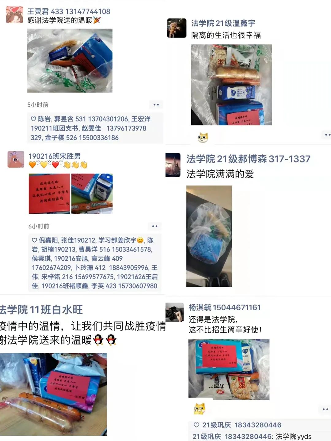 他们叮嘱同学们保持良好心态,积极配合学校,按时作息,希望他们合理安排学习生活,安全平稳度过隔离期。“疫情隔开的是距离,不是人心,让我们心连心,手牵手,共同战胜疫情”,温暖的寄语,使同学们感受到了来自法学院全体师生的关怀。