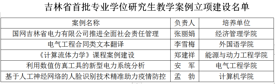 近日,吉林省教育厅公布了吉林省首批研究生精品示范课程和专业学位研究生教学案例立项建设名单,东北电力大学遴选推荐的5门研究生课程全部入选吉林省首批研究生精品示范课程立项建设课程,遴选推荐的5个专业学位研究生教学案例全部入选吉林省首批专业学位研究生教学案例立项建设项目。