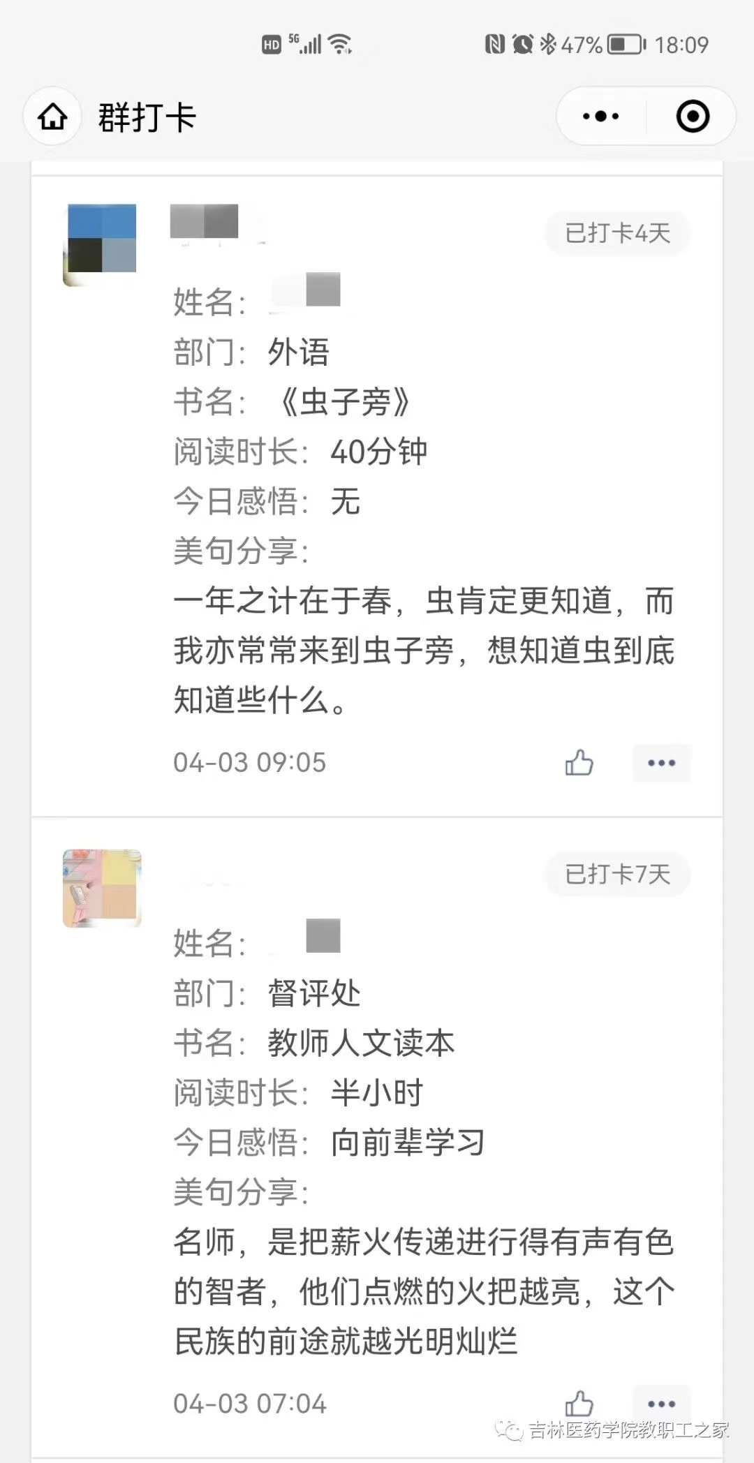 读书群里,老师们不但利用打卡程序记录自己每天的阅读情况,还在群内分享心得,从书中内容到生活感悟,让阅读滋养心灵,让书香传递温暖,为抗疫筑起一道精神防线。老师们纷纷表示,借助活动平台来督促自己养成良好的阅读习惯,和志同道合的同事共同享受阅读的快乐是特别幸福的事,希望疫情过后依然保留读书群,有机会开展线下读书活动,面对面交流。
