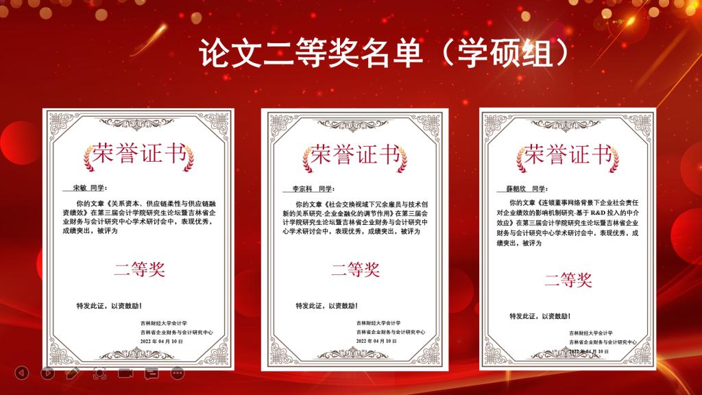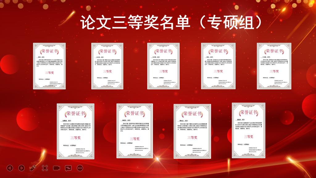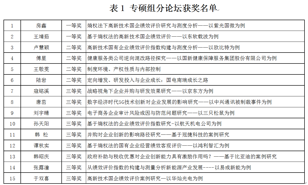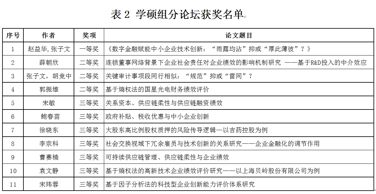 会计学院此次研究生学术活动历时4个多月,共收到参会论文44篇。经过学院8名青年博士教师从论文结构、语言表达和研究深度三个方面匿名盲评,最终筛选出投稿论文总量的60%(26篇论文)进行交流汇报,学硕11篇,专硕15篇。学术论坛交流中,会计学院8名青年博士教师作为评委再次从论文选题、论文结构、语言表达与PPT制作四个方面现场打分,最终评选出学硕组一等奖1名、二等奖3名、三等奖7名;专硕组一等奖2名、二等奖4名、三等奖9名。