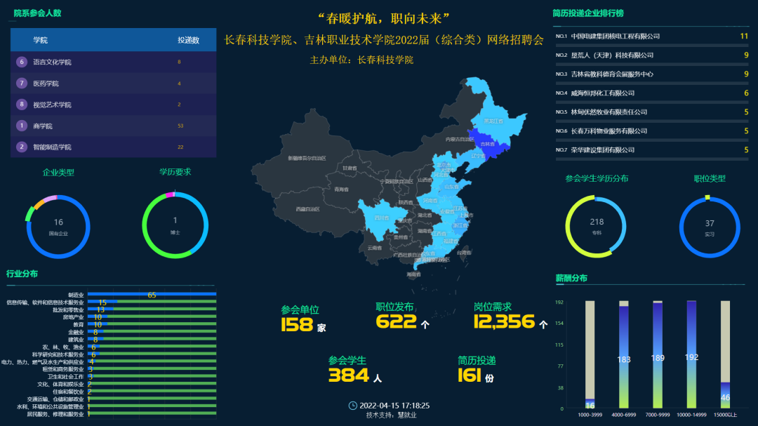 在春暖花开、阴霾即将过去的时刻,长春科技学院毕业生迎来了今年学校第四场网络招聘会。4月15日,由长春科技学院携手吉林职业技术学院主办、慧就业平台承办的“春暖护航、职向未来”长春科技学院&吉林职业技术学院2022届(综合类)网络招聘会如期举行。此次招聘会是全面落实金博宝最新官方网站查询网址 和省教育厅部署要求的重要组成部分,是贯彻落实4月9日学校就业工作网络视频会议要求的实际步骤,是着眼就业需求,积极为毕业生提供更多优质就业服务的具体举措。