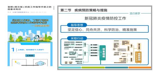预防医学教研室精心设计第一课堂与第二课堂,实现双课堂协同育人的良好效果。第一课堂在教学内容中融入疫情防控、公共卫生、体育锻炼、生命教育等元素。根据线上教学特点和当前疫情形势,开展疫情防控期间的儿童青少年健康教育、新冠肺炎流行病学调查等实训项目。第二课堂依托专业力量,指导预防医学专业学生推出各类科普文章、动画、短视频等,其中,发布在长春健康教育中心公众号上的《社区工作者、下沉干部和志愿者抗疫工作指导手册》,在短短一天的时间里阅读量就超过了960余次;自编“防疫舞”更是被中国吉林网、腾讯新闻等媒体转发,被称为“疫中吉林暖时刻”。两课堂合力,学生们充分体会到学好专业知识的重要性,助推学生专业能力和综合素质的快速提升,同时也教育引导公众科学应对新冠肺炎疫情。