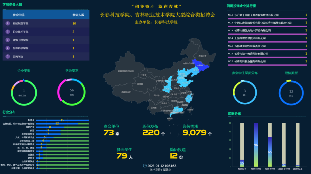 本次招聘活动紧紧围绕吉林省关于“创业奋斗 就在吉林”发展战略,深度服务吉林省企业发展,充分发挥校园招聘主渠道作用,为用人单位及毕业生搭建精准供需对接平台。招聘会共吸引全国73家企业参会,聚焦制造业、批发和零售业、信息传输软件和信息技术服务业、教育业、建筑业等多个行业人才需求,专业需求涵盖学校全部学科专业,提供9079个就业岗位。共有87名毕业生入场参会,投递简历18份。