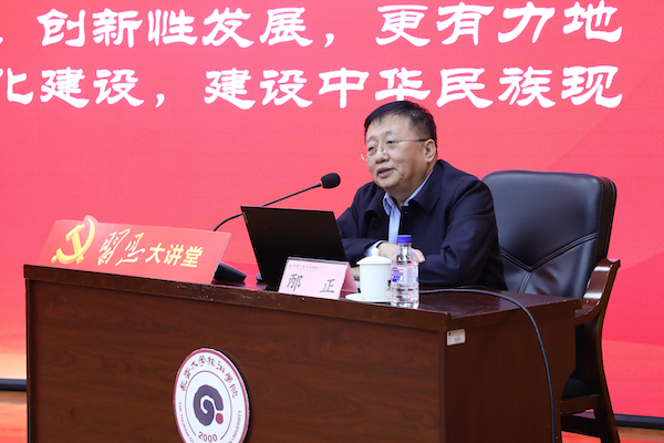 邴正教授从围绕深刻把握中华文明的突出特性、深刻理解“两个结合”的重大意义及如何更好地担负起新的文化使命展开生动阐述。他指出,党的十八大以来,党中央在领导党和人民推进治国理政的实践中,把文化建设摆在全局工作的重要位置。经过多年不懈努力,文化传承发展呈现出新的气象、开创了新的局面,社会主义文化强国建设迈出坚实步伐。我们要在实践中不断深化对文化建设的规律性认识,在新的起点上继续推动文化繁荣、建设文化强国、建设中华民族现代文明,是我们在新时代新的文化使命。整场报告主题鲜明、内容丰富、事例鲜活、引人入胜,既有理论高度,又有实践深度,更有历史维度,对全校师生如何结合主题教育,坚持用马克思主义立场观点方法,推动中华优秀传统文化创造性转化、创新性发展,提供了强有力的理论指导。