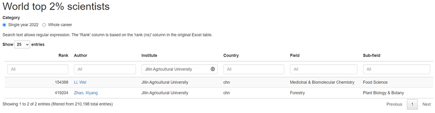 近日,美国斯坦福大学(Stanford University)与爱思唯尔(Elsevier)联合发布2023年度“全球前2%顶尖科学家榜单”(World’s Top 2% Scientists),吉林农业大学生命科学学院李伟教授、林学与草学学院赵曦阳教授入选“2023年度科学影响力排行榜”榜单,实现吉林农业大学高水平人才队伍建设新的突破。