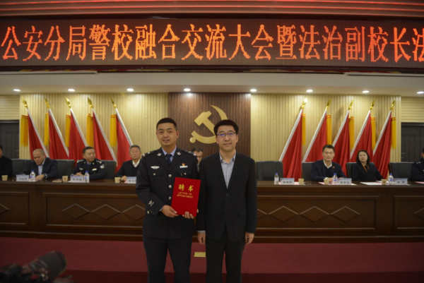 12月7日,长春科技学院和双阳公安分局警校融合交流大会暨法治副校长法治辅导员聘任仪式在长春科技学院隆重举行。双阳区副区长、公安分局局长刘岱峰,副局长索贵成及接受学校聘任的11名分局中层领导,长春科技学院董事长张电达、校长栾立明、党委书记林佳彬、党委副书记宋学山、副校长刘晓辉、党委副书记高芳、党政办公室主任孙大伟、机关干部、各学院领导及全体学工干部出席。党委副书记高芳传达了省公安厅、省教育厅《关于推进公安民警兼任法治副校长法治辅导员的指导意见》,党委副书记宋学山宣读了聘任法治副校长和法治辅导员的决定,党委书记林佳彬为法治副校长和法治辅导员颁发了聘书,法治副校长法治辅导员代表韩天作了表态发言,双阳区副区长、公安分局局长刘岱峰和校长栾立明分别作了讲话。