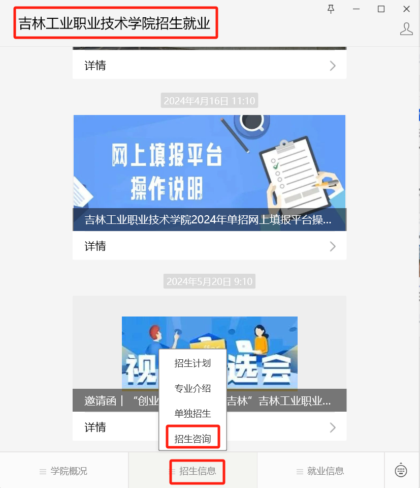 关注“吉林工业职业技术学院招生就业”微信公众号,点击招生信息中的“招生咨询”进入在线答疑平台,查询报考常见问题,对于未解答的问题,可点击留言咨询以便老师及时回复。