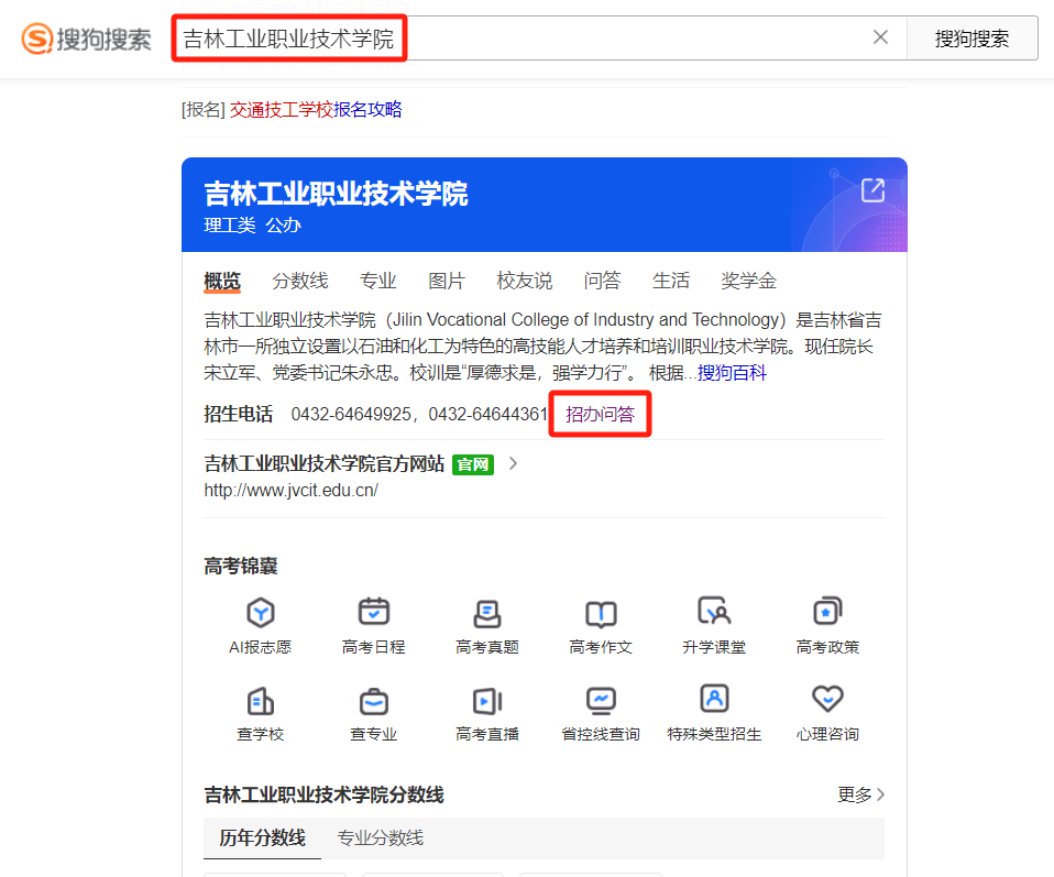 搜狗浏览器搜索“吉林工业职业技术学院”,点击学校页卡的“招办问答”模块,跳转至招生咨询平台,在问答页面点击查询报考常见问题,对于未解答的问题,可点击留言咨询以便老师及时回复。
