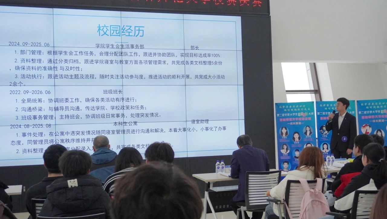 经过激烈角逐,何媛媛(数学与计算机学院)和陈佳彤(音乐学院)分获就业赛道和成长赛道一等奖,孟津好(生命科学学院)、彭敏(外国语学院)和曹颖(文学院)、姜源靖(数学与计算机学院)分获就业赛道和成长赛道二等奖,马羽卓(文学院)、王泽禹(数学与计算机学院)、牟立伟(信息技术学院)和刘雨杉(马克思主义学院)、赵增爽(经济管理与法学学院)、鱼潇彤(音乐学院)分获就业赛道和成长赛道三等奖。学校党委副书记韩金玉和评委分别为获奖选手颁奖。