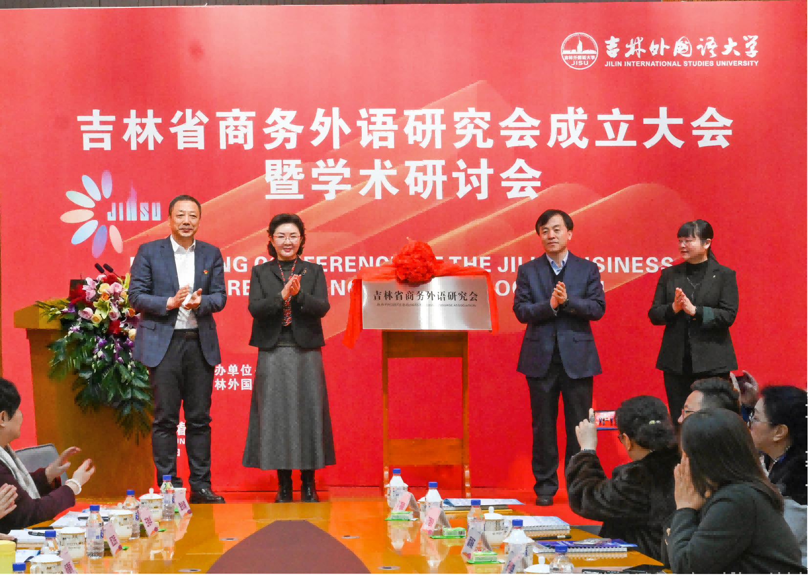 1月5日上午,吉林省商务外语研究会成立大会暨学术研讨会在吉林外国语大学国际交流中心举行。秦和校长与吉林省社会科学院副院长郭连强、省外语学会会长张玫玫、省民政厅社会组织管理局局长吴志伟共同为“吉林省商务外语研究会”揭牌,标志着该研究会正式落户吉林外国语大学。