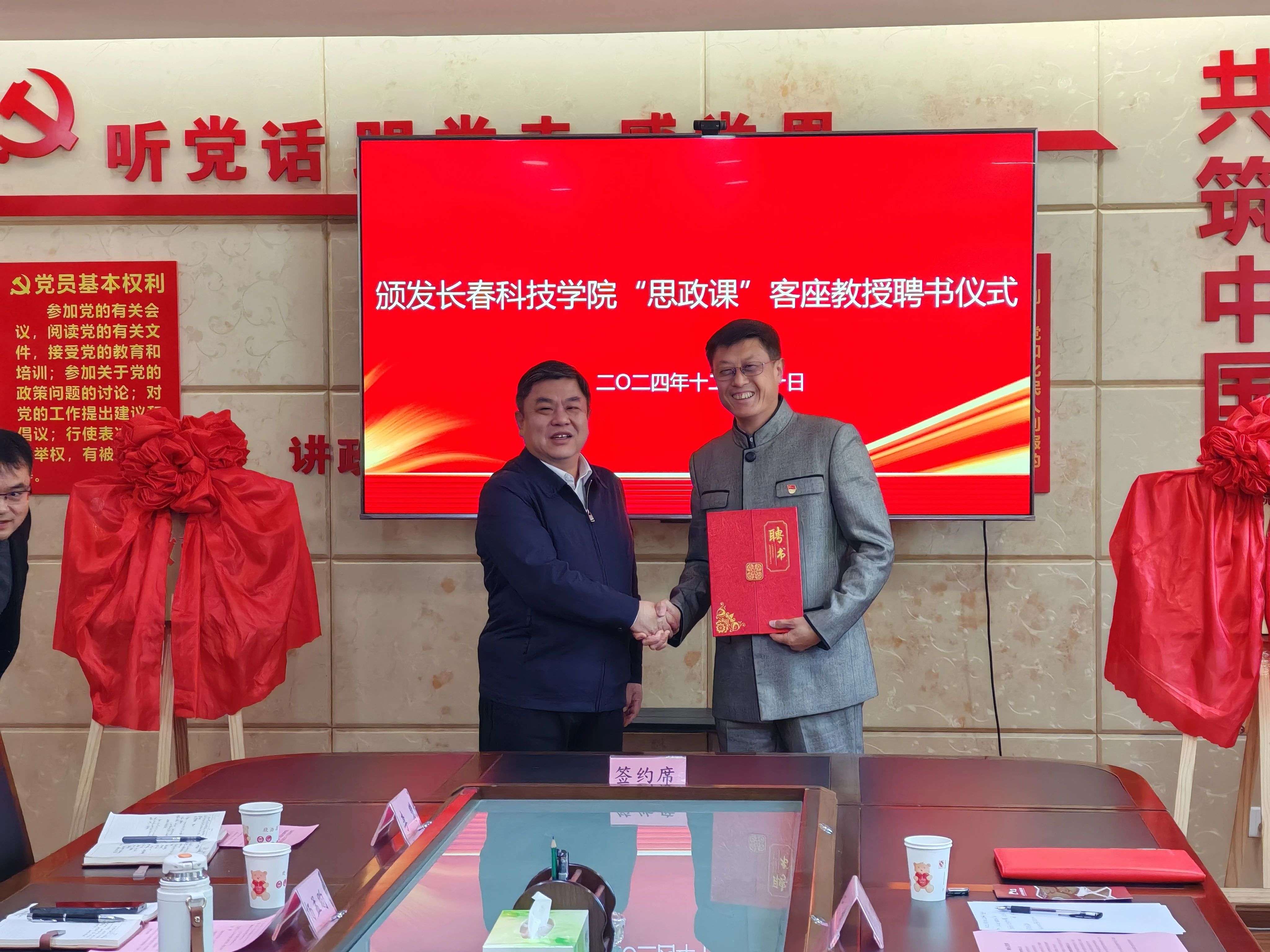长春科技学院党委书记崔高嵩为抗震救灾精神宣讲团成员孟祥柱博士颁发长春科技学院思政课客座教授聘书