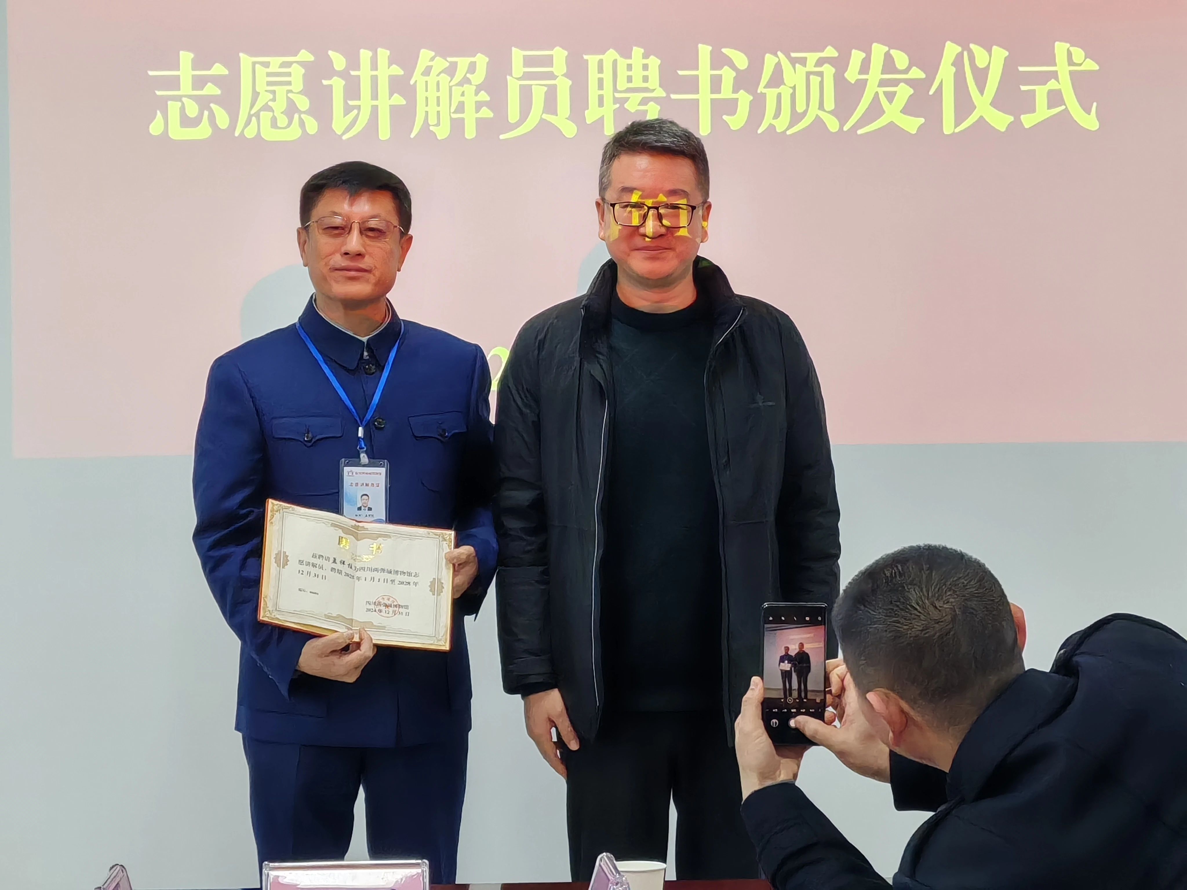 四川两弹城博物馆馆长刘风才为长春科技学院特聘思政课客座教授孟祥柱教授颁发四川两弹城博物馆志愿讲解员聘书