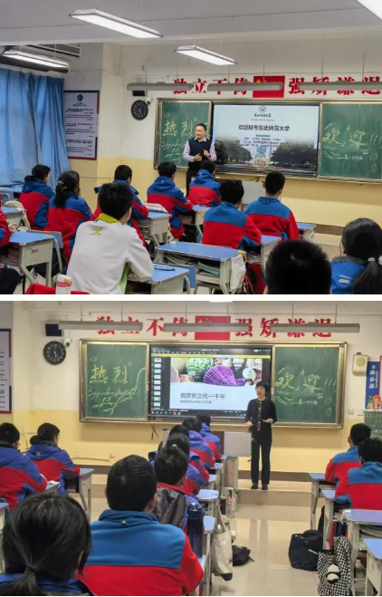 在西安市远东第一中学、西安市高新第一中学,学院副院长陈彦旭教授为师生做了题为《基于AI语言大模型的外语学习新范式》的讲座,副院长金万锋向师生介绍了东北师范大学的教育资源、专业特色及办学优势等方面内容。