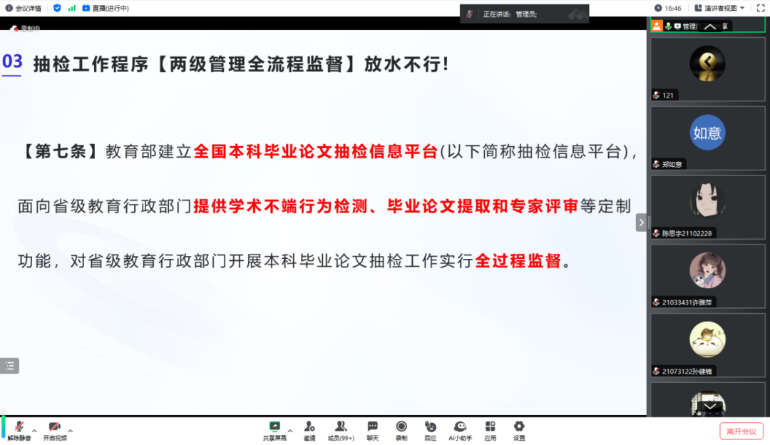 本次培训活动紧密围绕当前长春工业大学人文信息学院毕业设计(论文)的工作进度,聚焦毕业设计(论文)写作过程中的关键环节与痛点,结合毕业设计(论文)抽检工作内涵和长春工业大学人文信息学院规范化要求,精心策划了培训内容。培训内容覆盖了论文得分点分析、论文结构功能、论文查重率建议、抽检要求拆解、学术不端行为后果、论文质量的提升等内容,运用生动的图示和案例对学生们现阶段关心的问题进行了深入详细的讲解。在此过程中,不断强调学术不端行为的严重后果,提醒学生们牢记学术诚信,切忌学术不端行为。
