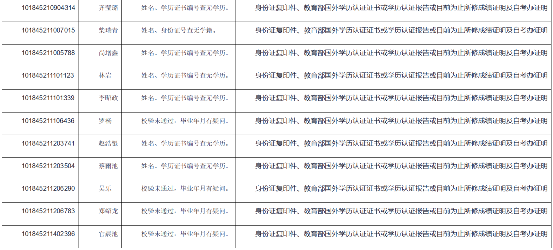 请以下学历校验未通过考生请于3月21日至3月24日间根据要求在《延边大学研究生报考服务系统》其他学科要求材料中上传相关证明材料并往研究生院招生科官方邮箱发送相关证明材料(标题:xljy+姓名+考生编号)
