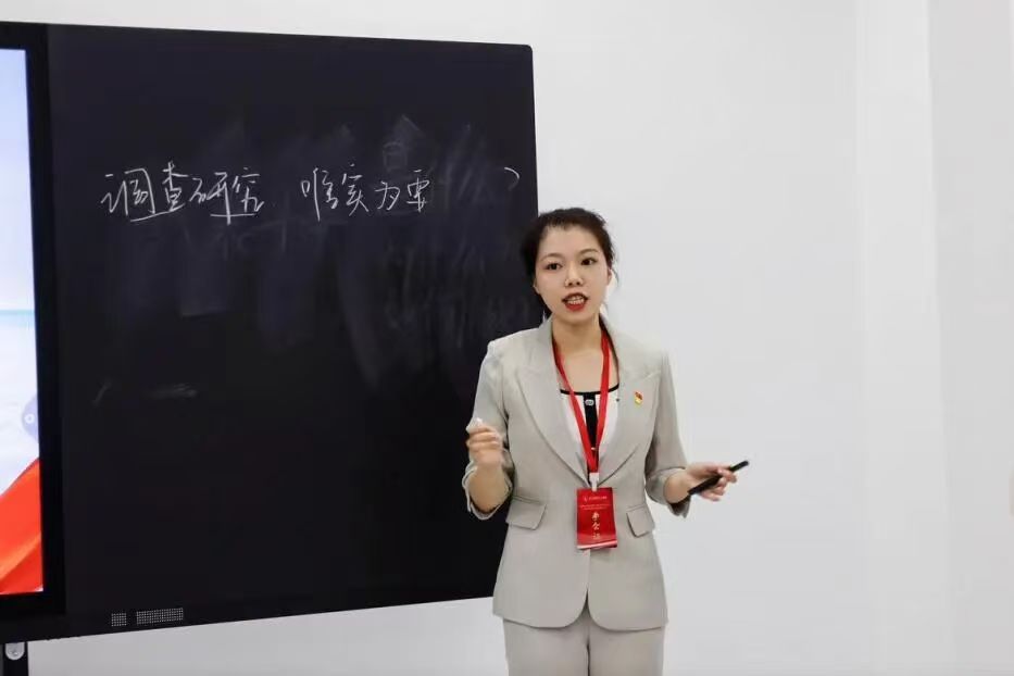 教学展示环节,冯静宜老师在《毛泽东思想和中国特色社会主义理论体系概论》课程比赛中,以《调查研究唯实为要》为题,梳理了党在各个时期的调研实践,强调了调查研究的重要性。