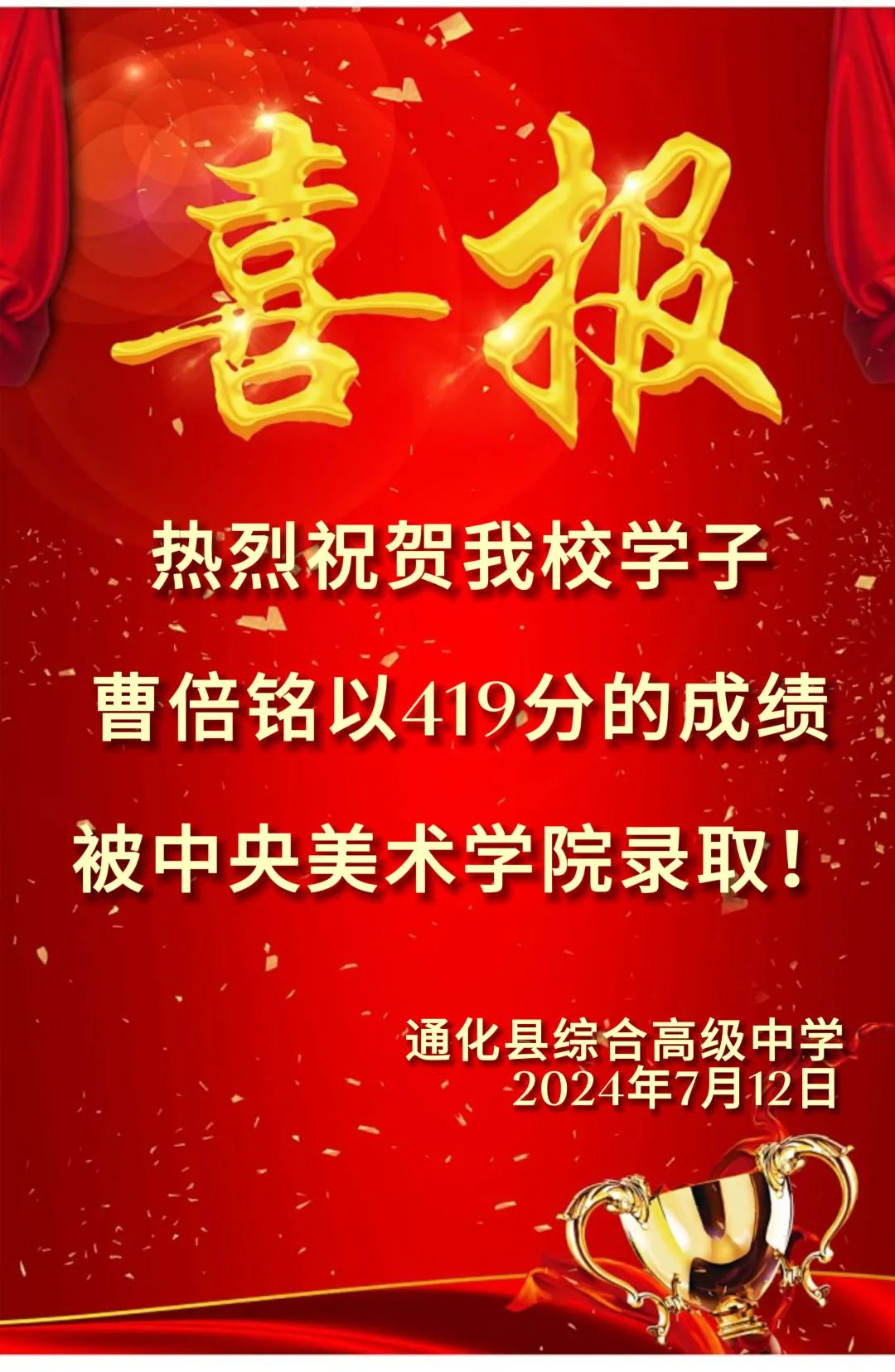 通化县综合高级中学:喜报!热烈祝贺综合学子曹倍铭以419分的成绩被中央美术学院录取!