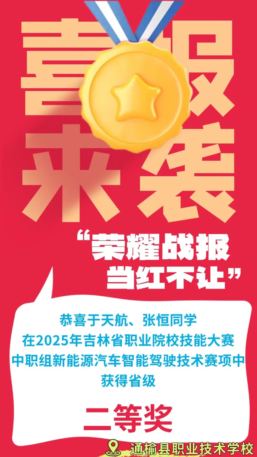 恭喜通榆县职业技术学校于天航、张恒同学在2025年吉林省职业院校技能大赛中职组新能源汽车智能驾驶技术赛项中获得省级二等奖。