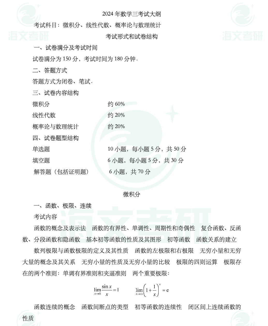 2024年考研数学(三)大纲原文