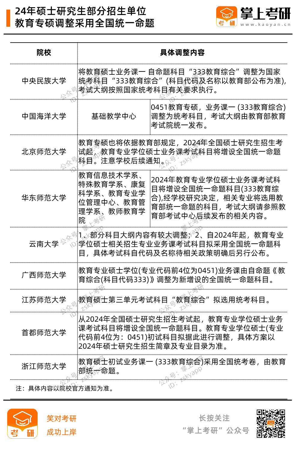 目前已有部分院校宣布从2024考研起,教育专硕采用全国统一命题科目,下图为部分院校通知,供大家参考~