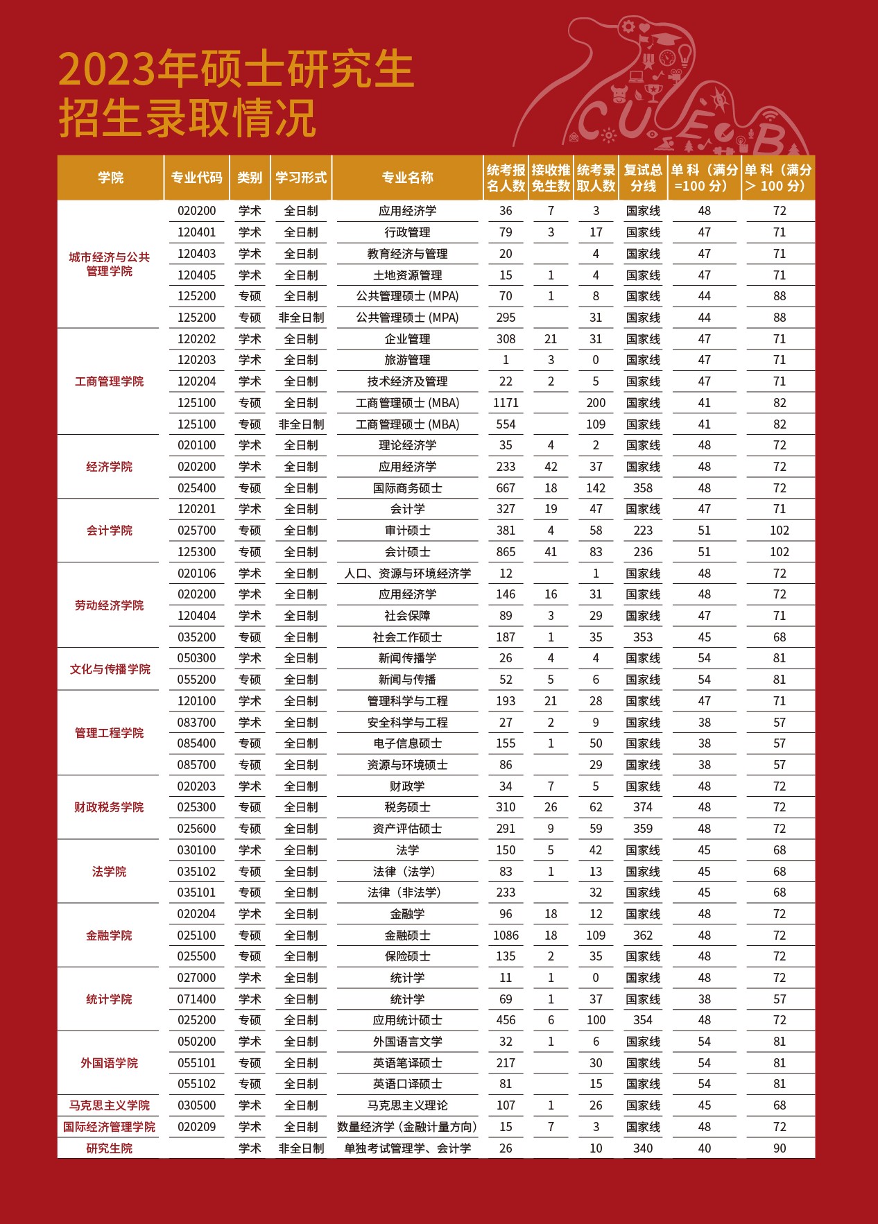 首都经济贸易大学2023研究生实际录取人数与复试分数对照表