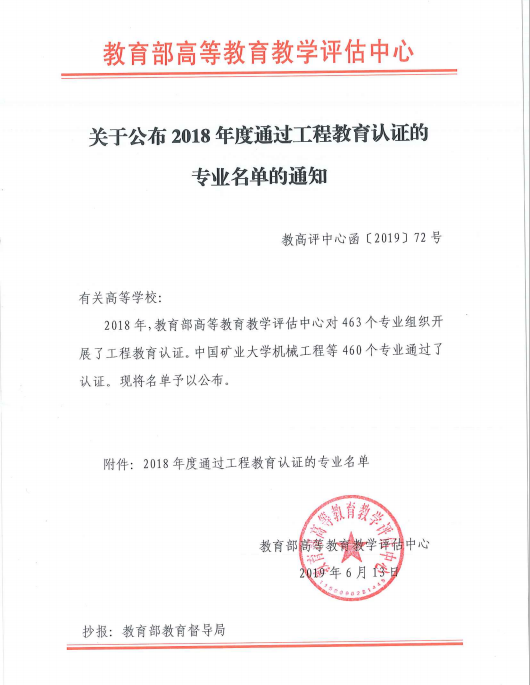 图为2018年度通过工程教育认证专业的批文