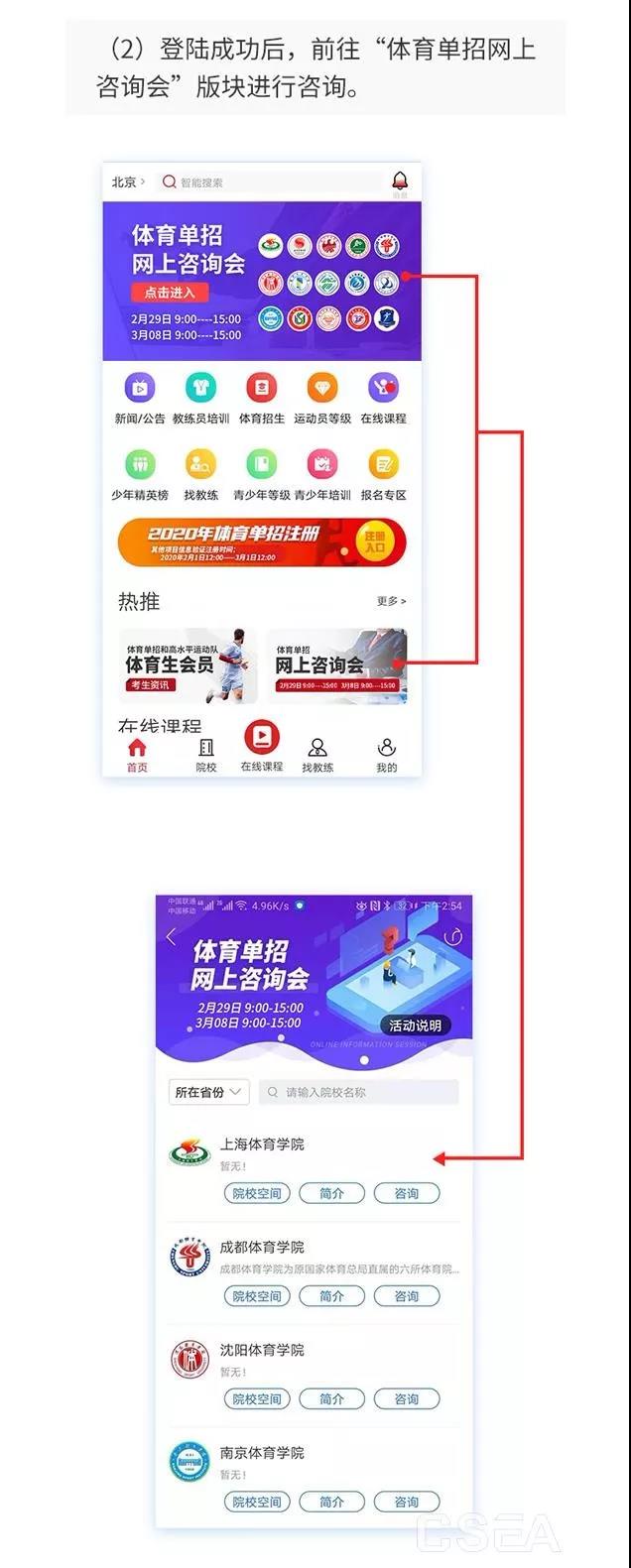 2020年体育招生网上咨询活动平台为中国运动文化教育网(www.ydyeducation.com)、CASE APP(www.univsport.com/app),请各位考生登录CASE APP“网上咨询会活动专区”积极参与活动。