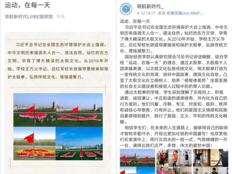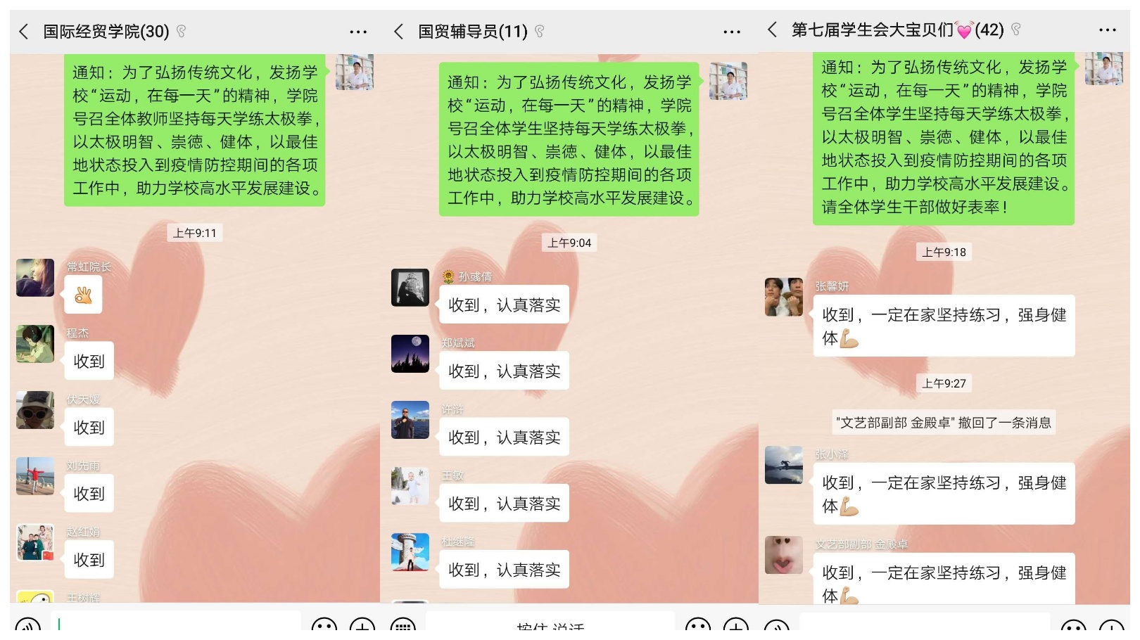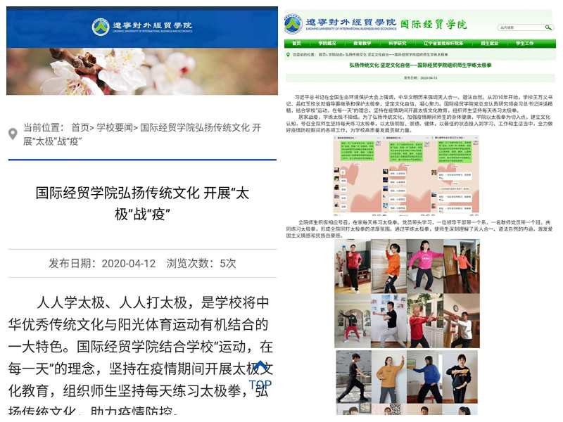 居家战疫,学练太极健体。为了弘扬传统文化,加强疫情期间师生的身体健康,辽宁对外经贸学院以太极拳为切入点,建立文化认知,号召全体师生坚持每天练习太极拳,以太极明智、崇德、健体,以最佳的状态投入到学习、工作和生活当中,全力做好疫情防控期间的各项工作,为学校高质量发展贡献力量。