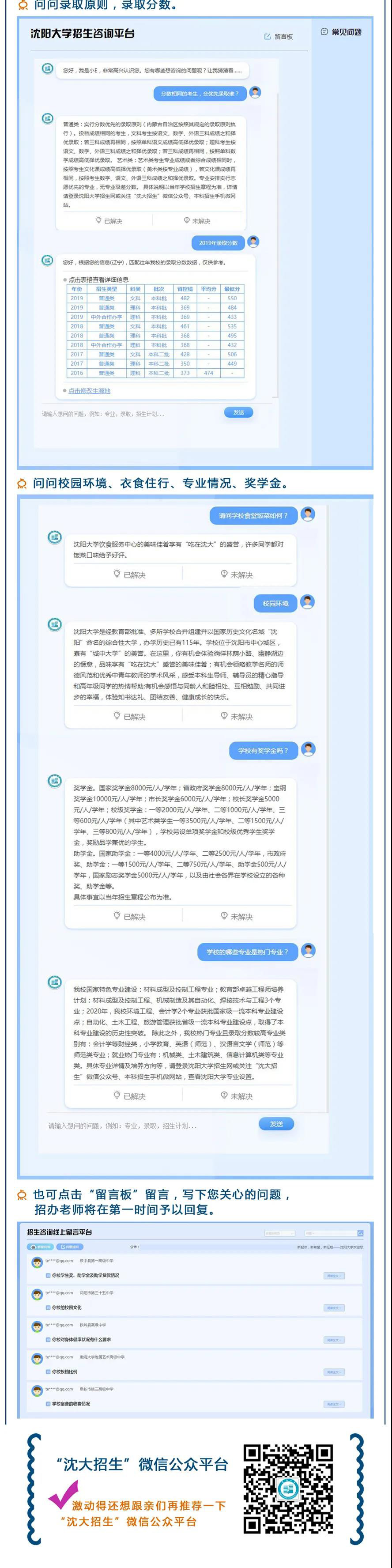 考生及家长可在微信公众号中搜索并关注“沈阳大学招生咨询”微信公众号,点击进入公众号可查询学校最新招生信息、招生动态等信息,此外在网站咨询一栏中点击“智能问答”,即可进行在线咨询或留言。