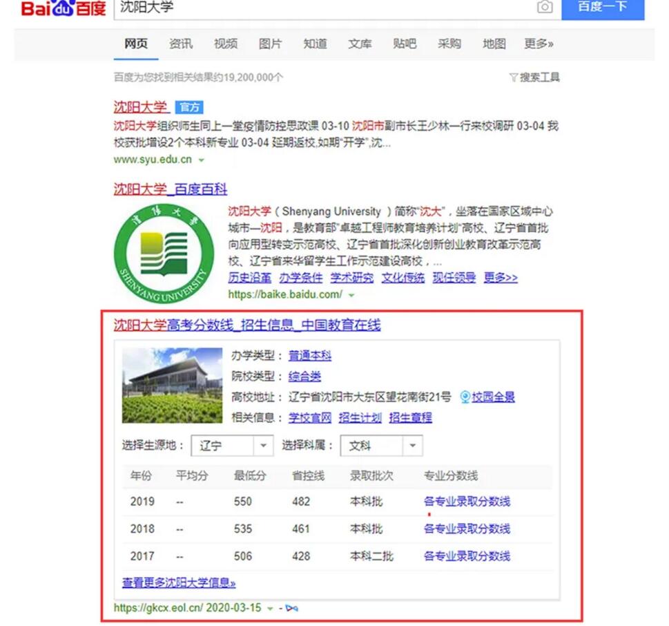 百度检索“沈阳大学”,点击进入金宝搏188入口 高考数据库,数据库中包含学校历年分数/招生专业等招生信息。