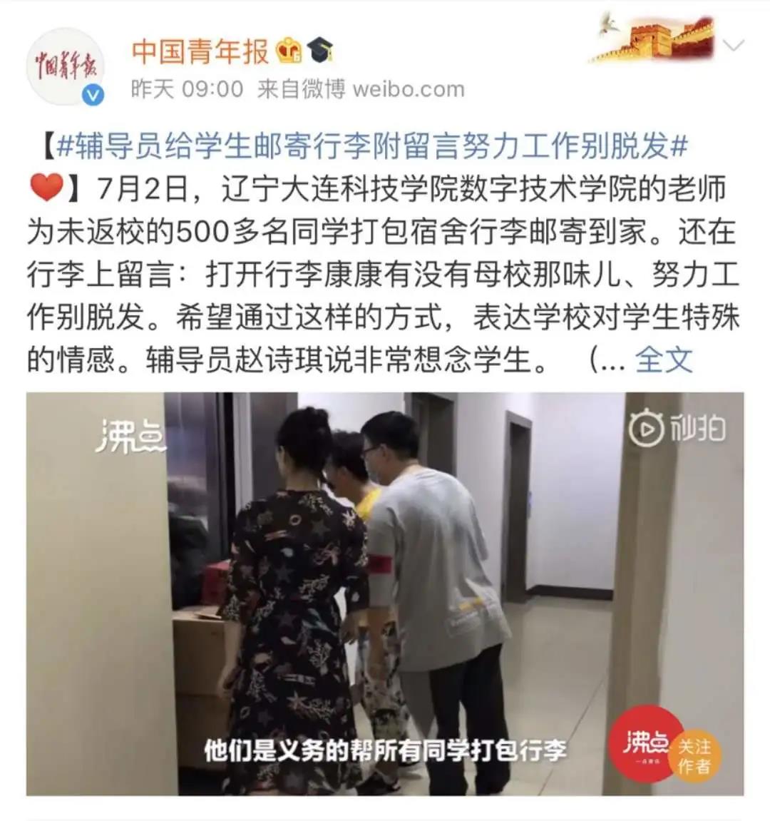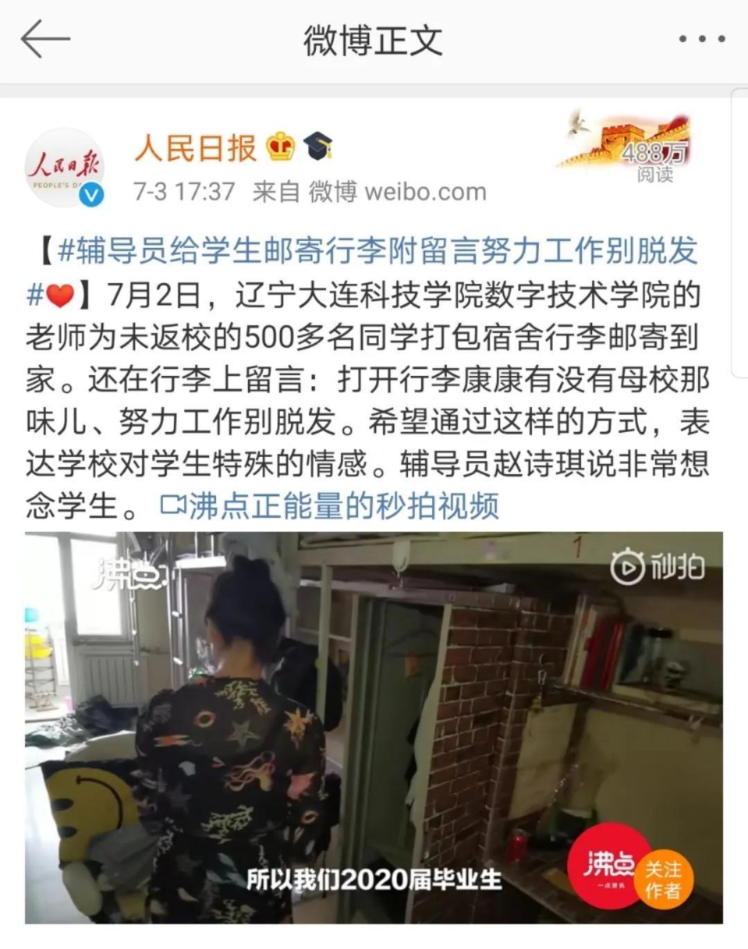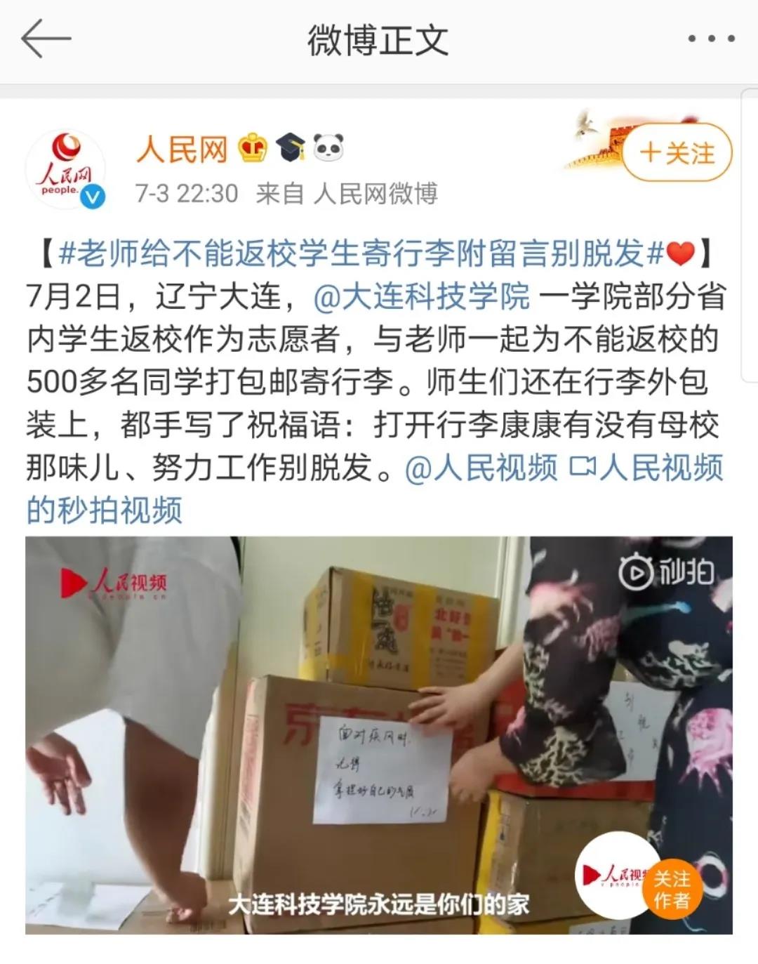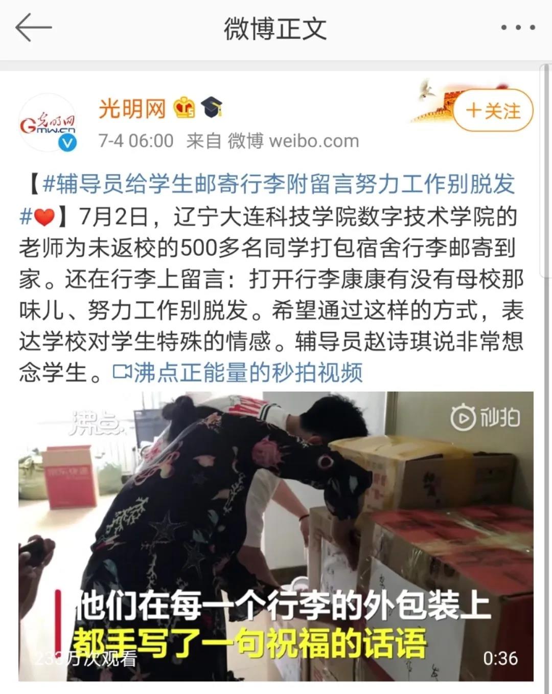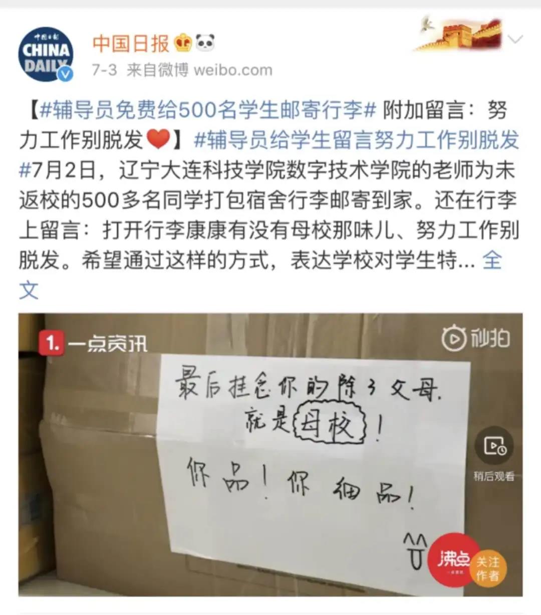 在打包行李的过程中,辅导员老师在行李上留下的祝福语在网络上走红,并登上微博热搜。央视新闻、人民日报、人民网、光明网、中国日报、中国教育报、中国青年报等媒体纷纷对此事进行了报道与转载,引发了社会各界和家长们的好评,让不能返校的大科毕业生们深感温暖。