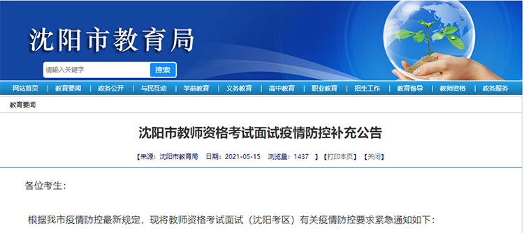 5月15日,沈阳市教育局发布《沈阳市教师资格考试面试疫情防控补充公告》: