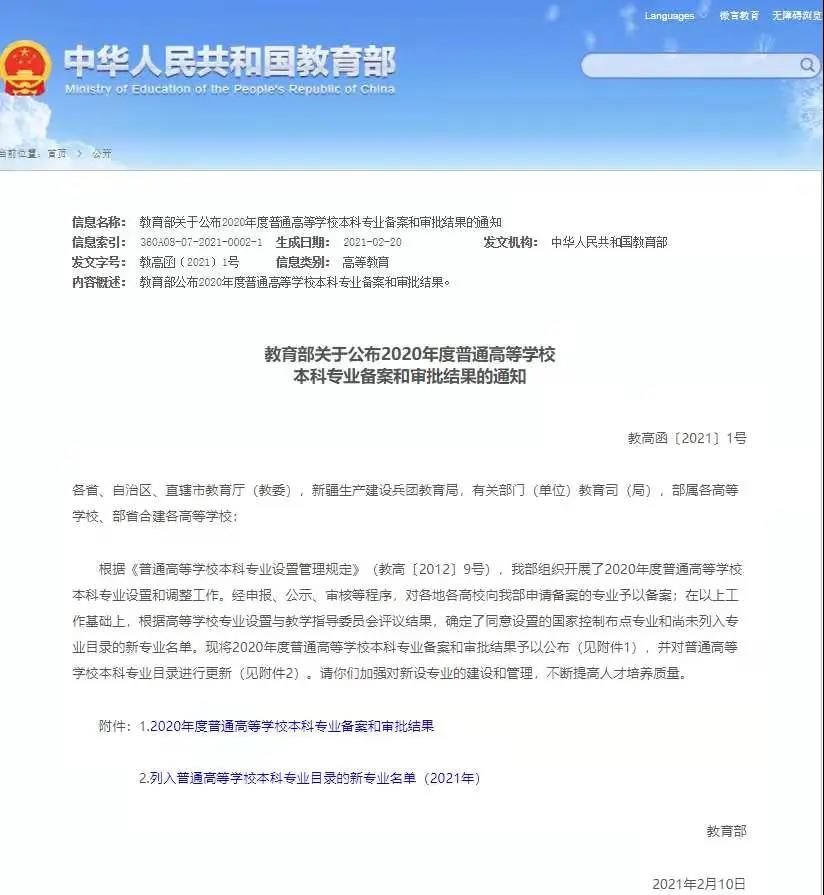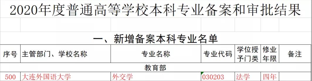 关于公布2020年度普通高等学校本科专业备案和审批结果的通知》(教高函[2021]1号)精神,大连外国语大学获准新增外交学专业。