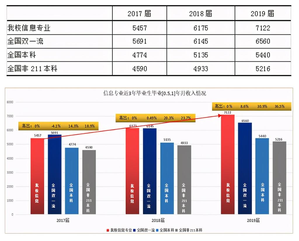 学校信息专业毕业生的平均月收入在2017届至2019届三年间持续增长,在2018届达到6175元,已经达到了全国双一流高校的本科毕业生平均月收入水平(高出30元/0.49%),到2019届达到了7122元,比全国双一流高校的本科毕业生平均月收入水平(高出612元/8.6%),比全国高校的本科毕业生平均月收入水平(高出1732元/30.9%),比全国非211高校的本科毕业生平均月收入水平(高出1956元/36.5%)。